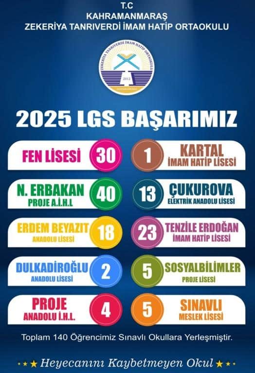 Okulumuz ilimizde LGS sınavında devlet okulları arasında ilk ikide yer alarak zirvede kalmaya devam ediyor. Sınavla öğrenci alan proje okullarına öğrencilerimizin %61'i, diğer güzide okullarımıza geri kalan öğrencilerimizin tamamı yerleşti.